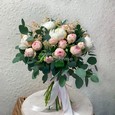 Букет розовых гербер, пионов и роз