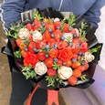 Красный букет из хризантем и нобилиса