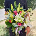 Букет белых лилий, хризантем и роз
