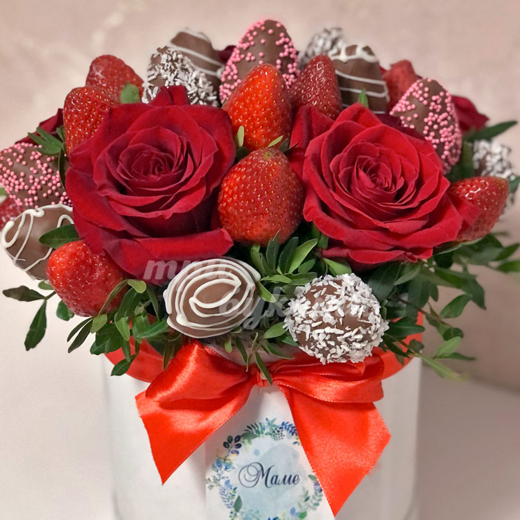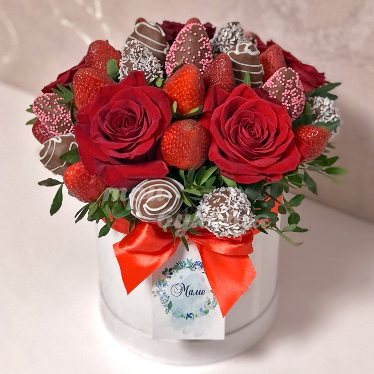 30 ягод клубники и 5 роз в коробке