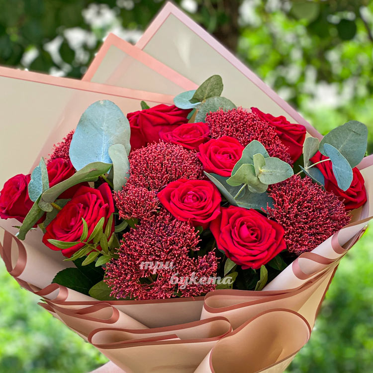 Букет из 11 красных роз с зеленью