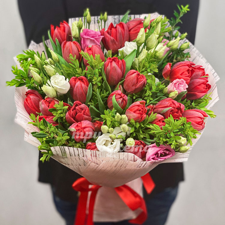 Букет из эустом и красных тюльпанов