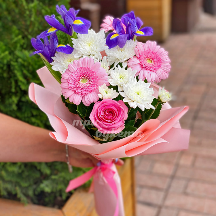 Букет из ирисов и розовых гербер