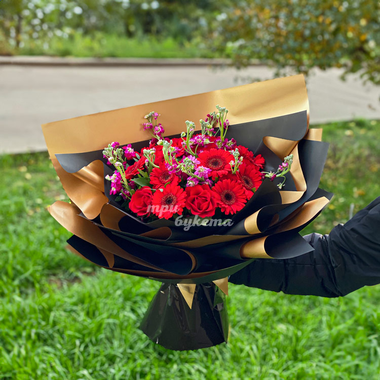 Букет красных гербер и розовых маттиол