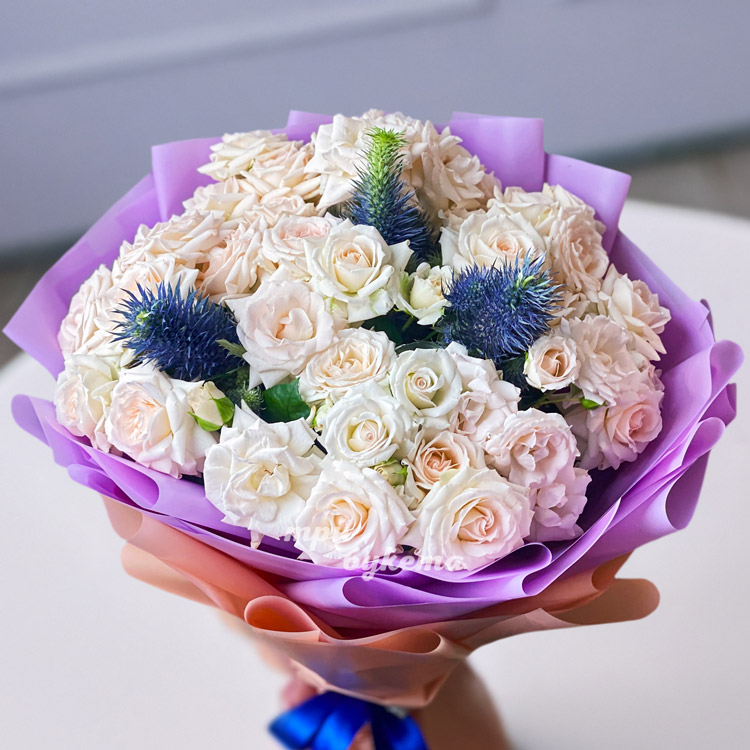 Букет нежных кустовых роз с эрингиумом