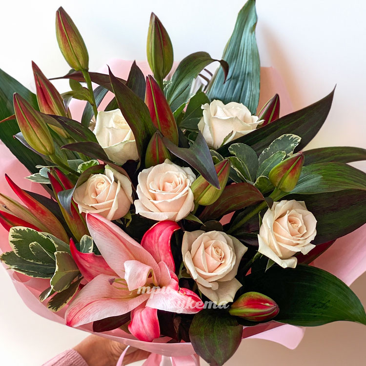 Букет розовых лилий и кремовых роз