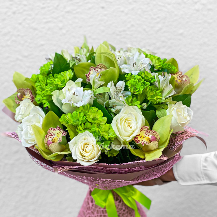 Букет зеленых хризантем и орхидей