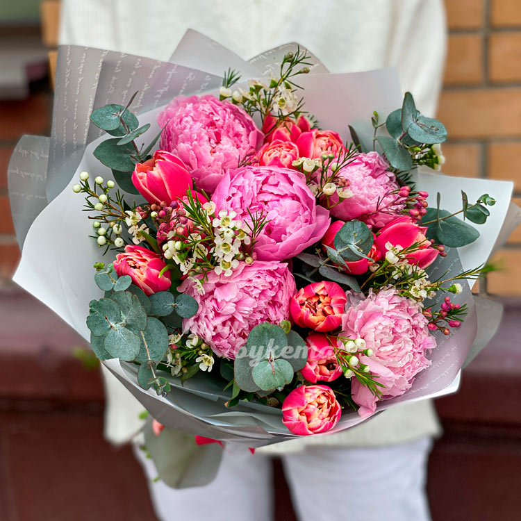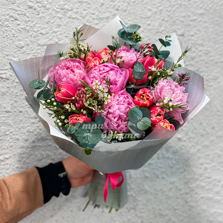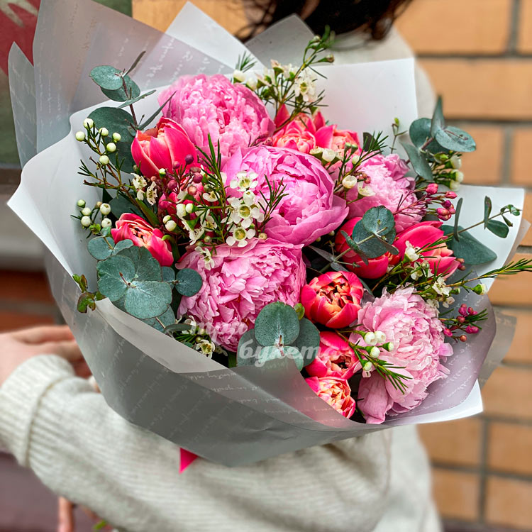 Розовые пионы и красные тюльпаны