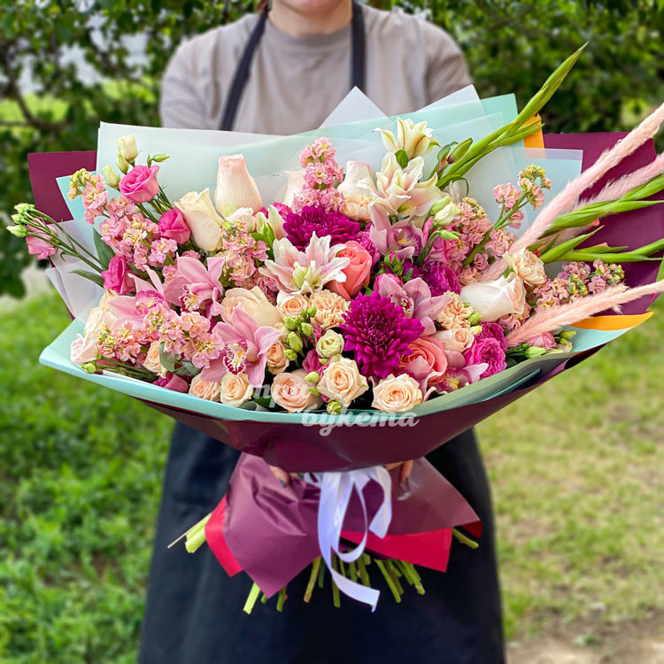 Розовый букет лилий, орхидей и маттиол