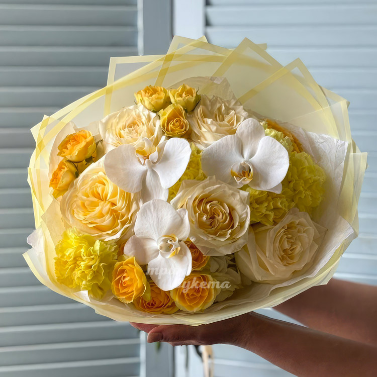 Ярко-желтый букет роз, гвоздик и орхидей