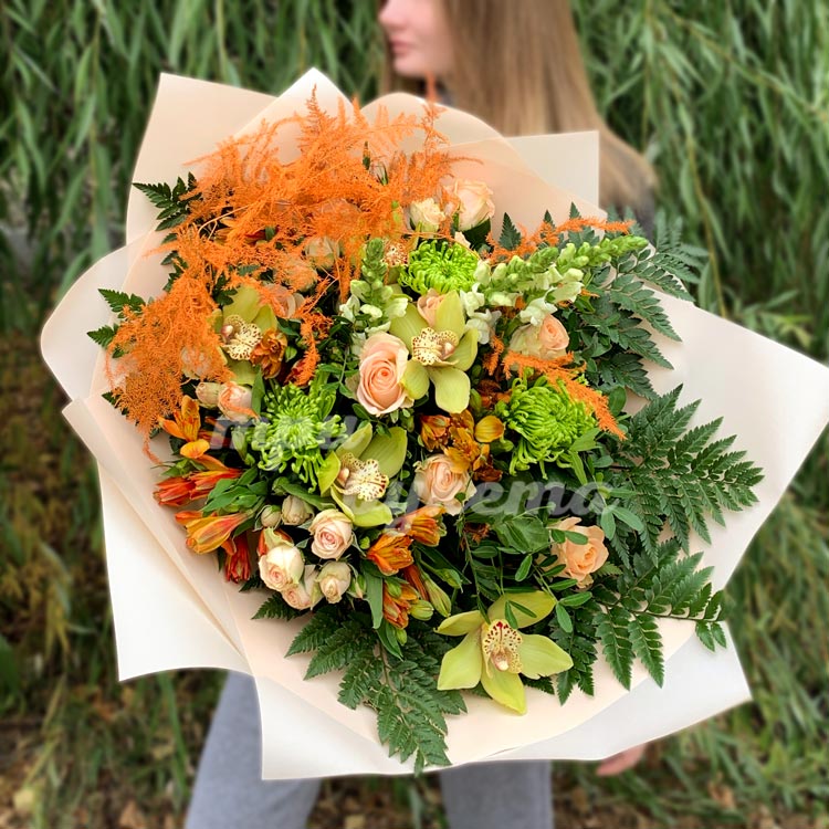 Зеленый букет из орхидеи и роз